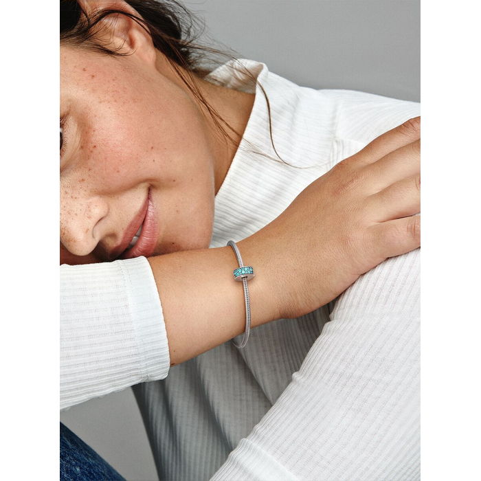 Maak balans en schoonheid onderdeel van je sieraad met onze hand-finished sterling zilver clipbedel. Hij is liefdevol bezet met groenblauwe zirkonia in pavé zetting voor een subtiele glans in je look. Pandora-clipbedels zijn een stijlvolle aanvulling op je sieraad. Je kunt ze gebruiken om secties te maken en dankzij de verborgen silicone grip blijven de bedels perfect op hun plek zitten. Deze pavé stijl kan je combineren met al je favoriete Pandora Moments sieraden. Let op! Deze clipbedel heeft een silicone grip en past niet op de dikkere gedeelten van de sieraden met een schroefdraadsysteem (twee bedelverdelers). Deze bedel kan wel op iedere andere plek op de chain aangebracht worden.